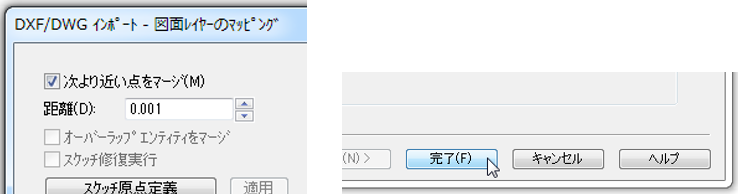 【寸法のインポート】にチェックを入れ、【次へ】をクリックします。 - 【次より近い点をマージ】にチェックが入っている事を確認し、完了します。